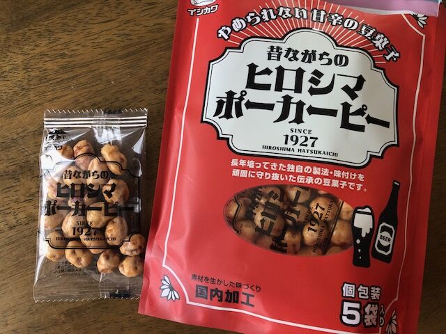地元広島の豆菓子屋さん「イシカワ」の「ヒロシマポーカーピー」という商品です。