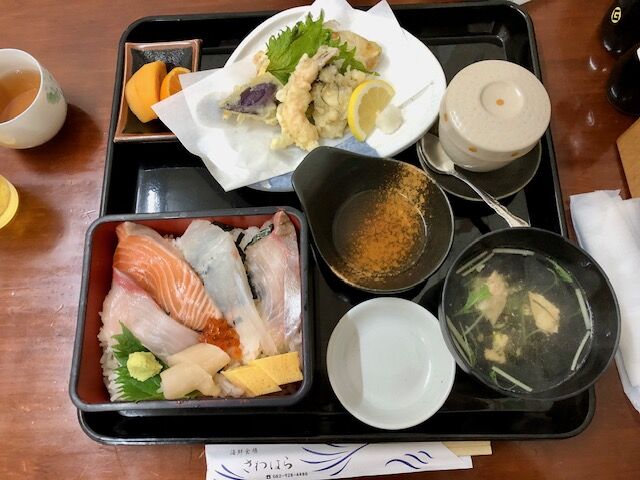海鮮丼、季節の天ぷら、茶わん蒸し、あら汁、季節のフルーツ。