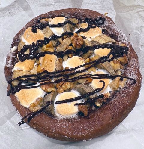 スモアは、マシュマロを溶かして、チョコやクッキーなどに挟んで食べるものだと思っていたんですが、これはチョコレートのパンの上にマシュマロとバナナ、くるみをのせて焼いてあります。